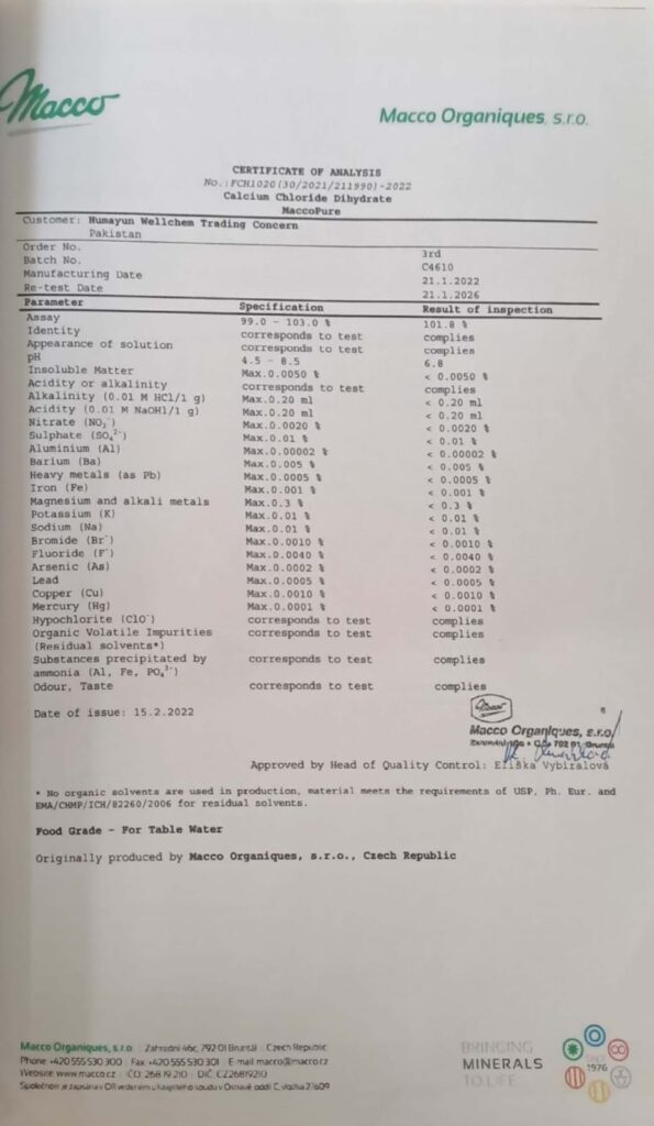 This COA confirms the quality and food-grade purity of Calcium Chloride (MaccoPure) for water treatment use.