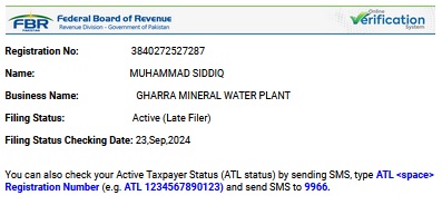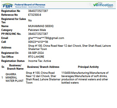 Tax registration record issued by Federal Board of Revenue for Muhammad Siddiq’s business registration.