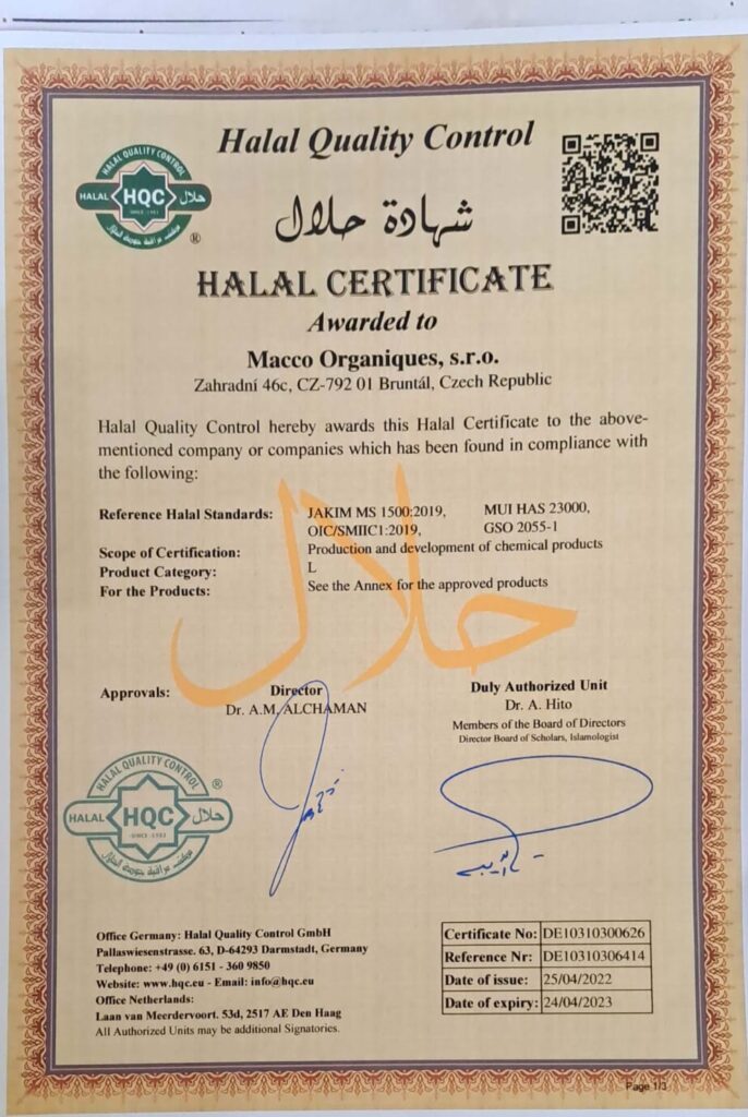 Macco Organiques, s.r.o. is certified halal by Halal Quality Control for chemical product development.